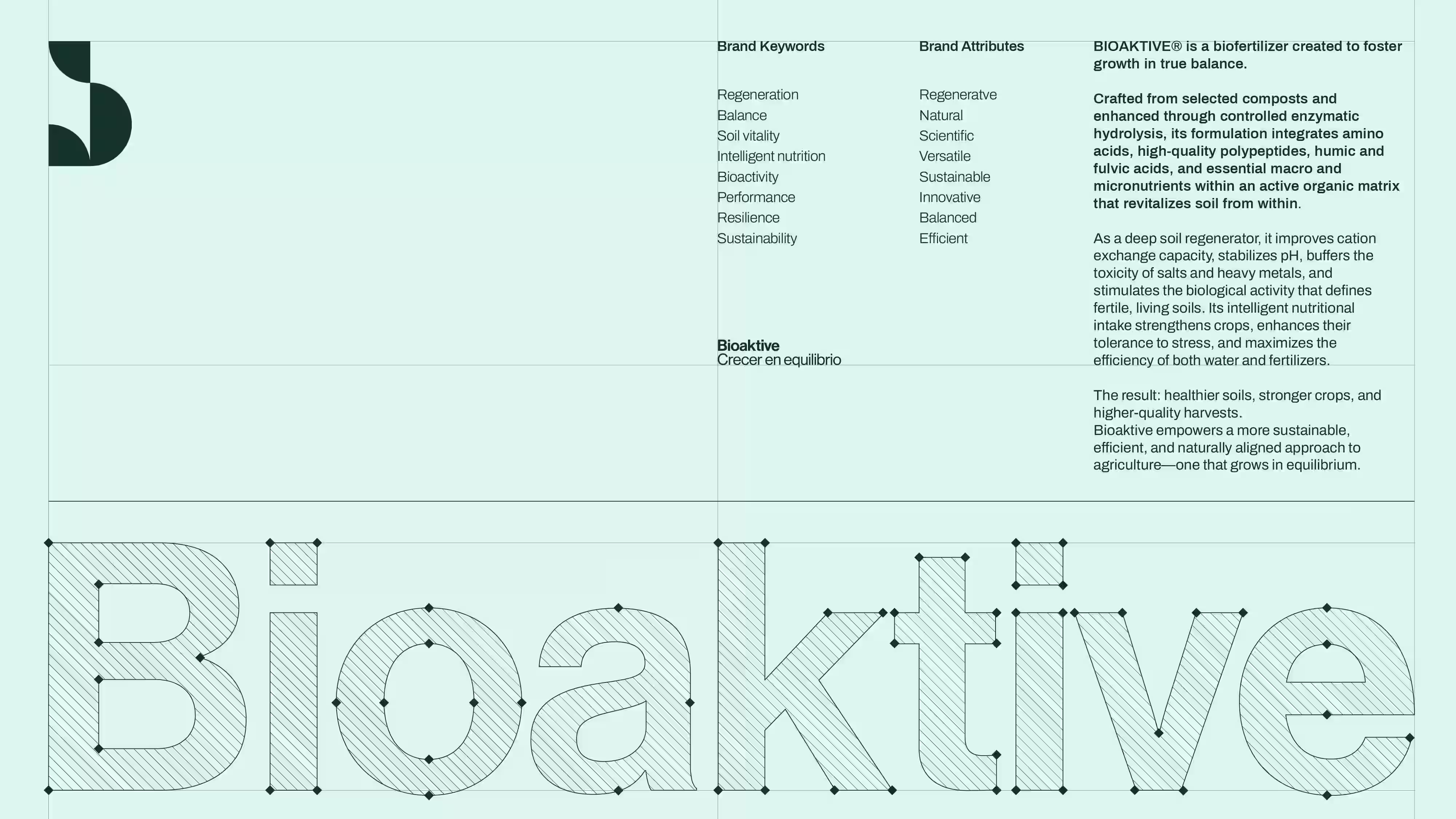El desafío fue construir una identidad capaz de representar el delicado balance entre ciencia y naturaleza que define a Bioaktive. Era necesario comunicar un producto técnico y efectivo sin perder sensibilidad, evitando los extremos: ni una estética puramente científica, ni un discurso únicamente naturalista. La marca debía posicionarse como un agente activo dentro del ecosistema del suelo, transmitiendo inteligencia, investigación y precisión, pero también cercanía, vida y conexión con la tierra.The challenge was to build an identity capable of representing the delicate balance between science and nature that defines Bioaktive. It was essential to communicate a technical and effective product without losing sensitivity, avoiding extremes: neither a purely scientific aesthetic nor an exclusively naturalistic narrative. The brand needed to position itself as an active agent within the soil ecosystem, conveying intelligence, research, and precision, while also expressing closeness, life, and a deep connection to the earth.